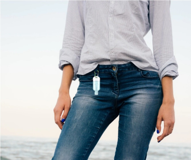 De asemenea,este prevazut cu clesti de tip breloc facand usoara prinderea acestuia de orice si facilitand dezinfectarea mainilor sau obiectelor fara a deschide geanta/rucsacul.