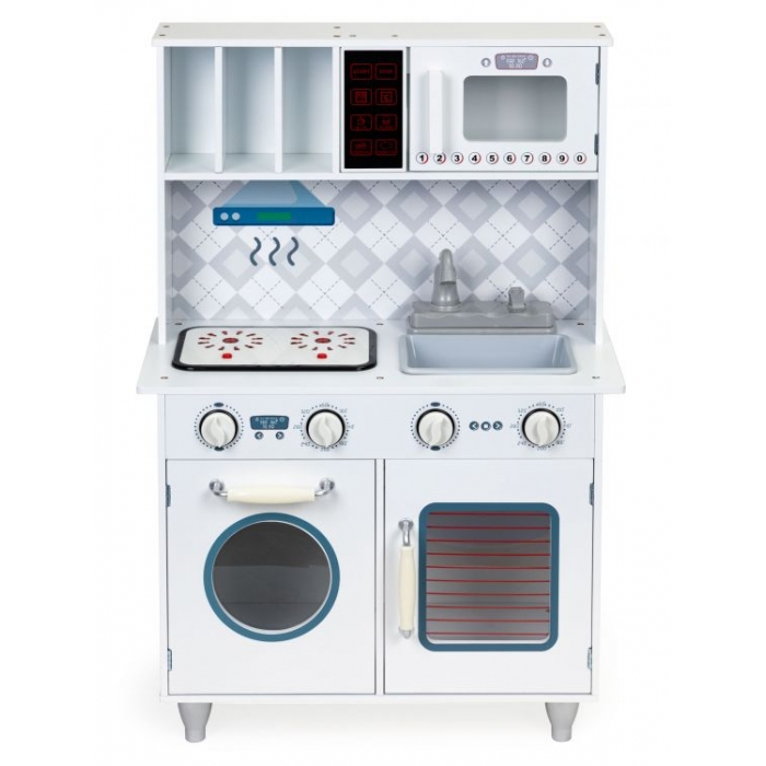 Tuturor copiilor le place sa imite adultii, iar datorita acestei bucatarii copilul tau va avea ocazia sa joace rolul unui bucatar. La dispozitia bucatarului se afla arzatoare cu butoane - pentru a seta temperatura corespunzatoare + sunetul apei clocotite. Un cuptor si o masina de spalat vase sunt situate sub blatul de lucru. In partea superioara exista un cuptor cu microunde care se deschide si un raft suplimentar pentru ustensile.