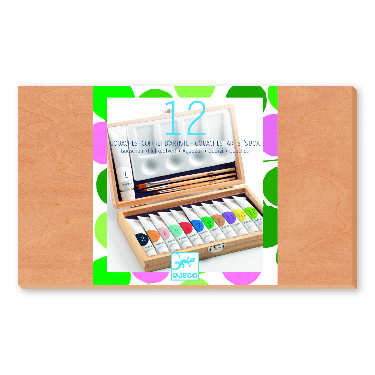Cutie din lemn cu 12 tuburi Culori Guase, 3 pensule, paleta O cutie frumoasă din lemn care conține 12 tuburi de guașă (11x tuburi de guașă de 12 ml în diferite culori + 1x tub de guașă albă de 18 ml), 3 pensule și paletă. O trusă completă de pictură pentru artiștii în devenire! Guașă foarte pigmentată cu culori opace. Vopsea ultralavabilă de pe mâini și haine. Un tub alb de 18 ml pentru amestecarea culorilor. 3 pensule de diferite forme. Conține: cutie din lemn, 12 culori gouache asortate în tuburi, 3 pensule și paletă. Fabricat din hârtie și carton certificate FSC®. AVERTISMENT: Contraindicat copiilor sub 3 ani, conține piese mici, pericol de sufocare. A se folosi sub directa supraveghere a unei persoane adulte. Producător: Djeco, Franța.