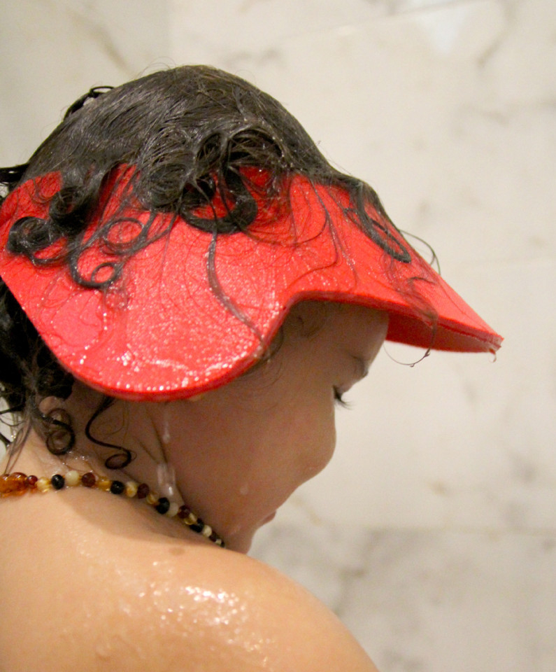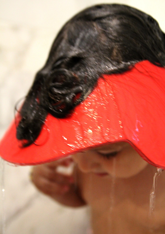 Ochisorii copilului sunt protejati de apa si sapun in timpul spalarii parului.