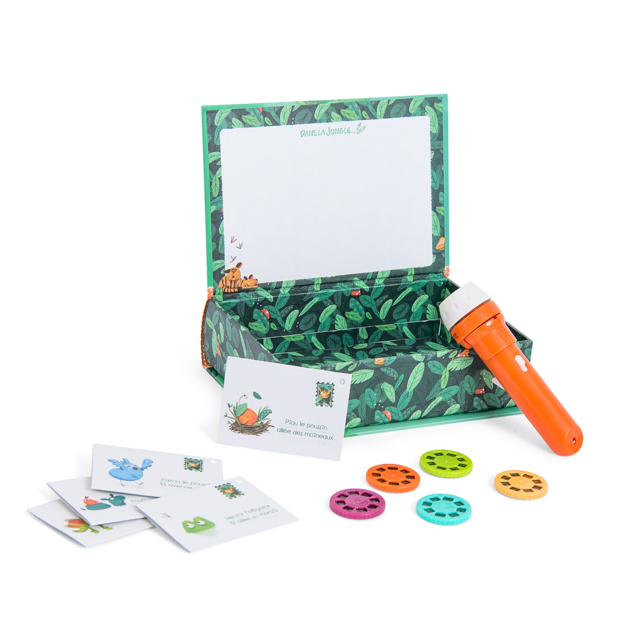 Cutie cu lanterna de proiectat povesti In jungla Cutie magnetică, concepută ca o carte, care conține o lanternă de proiecție cu 5 discuri cu povești diferite și 5 invitații la spectacole, sub forma unor mini-plicuri cu mesaje secrete. Organizați o sesiune de povești și trimiteți invitații prietenilor! Lanterna proiectează imagini color pentru a spune povești inedite, fără cuvinte, auditoriului său. Un moment magic pentru a petrece timpul împreună cu cei dragi și a îmbogăți imaginația copiilor. Introduceți discul ales în fanta lămpii, apasați butonul de pornire, focalizați și proiectați imaginea pe perete sau tavan, apoi rotiți discul pentru a proiecta următoarele imagini. Lampa proiectează imagini pe o distanță de până la 90 cm. Funcționează cu 3 baterii incluse (1,5 V AG13/LR44). Vârsta recomandată: 4 - 7 ani. Material: plastic ABS. Se curăță cu o cârpă moale și umedă. Producător Moulin Roty, Franța.