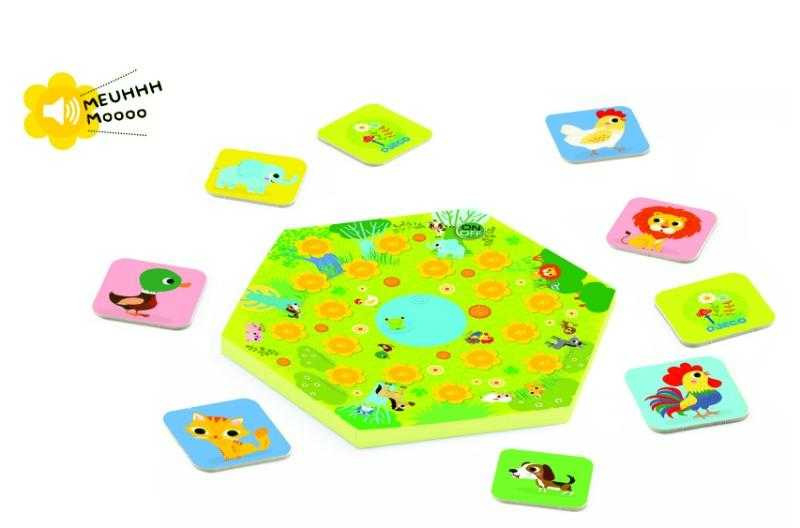 Joc cu sunete Memo Meuh Un joc de memorie amuzant. Antrenează-ți mintea și ascultă bine, memorând nu doar poziții ale pieselor de joc, dar și sunetele animăluțelor! La fiecare tură, totul se schimbă, așa că trebuie să fii atent mereu. Un joc clasic actualizat pentru a dezvolta memoria și abilitățile de ascultare ale copiilor. Stimulează memoria copiilor în timp ce îi antrenează să recunoască sunetele animalelor. Apăsați butonul pentru a amesteca sunetele înaintea începerii fiecarui joc! 3 baterii LR54 înlocuibile incluse. Conținut: tablă de joc cu sunet, 16 carduri și 16 markere „găsit” (3 baterii LR54 incluse). Reguli de joc disponibile în 10 limbi. Pentru 2-4 jucători. Vârsta recomandată: +3 ani. Confecționat din materiale și vopsele non toxice conform reglementărilor EN71&ASTM. AVERTISMENT: Contraindicat copiilor sub 3 ani. Conține părți mici. Se recomandă supravegherea copilului de către un adult în timpul jocului. Producător: Djeco, Franța Memo meuh