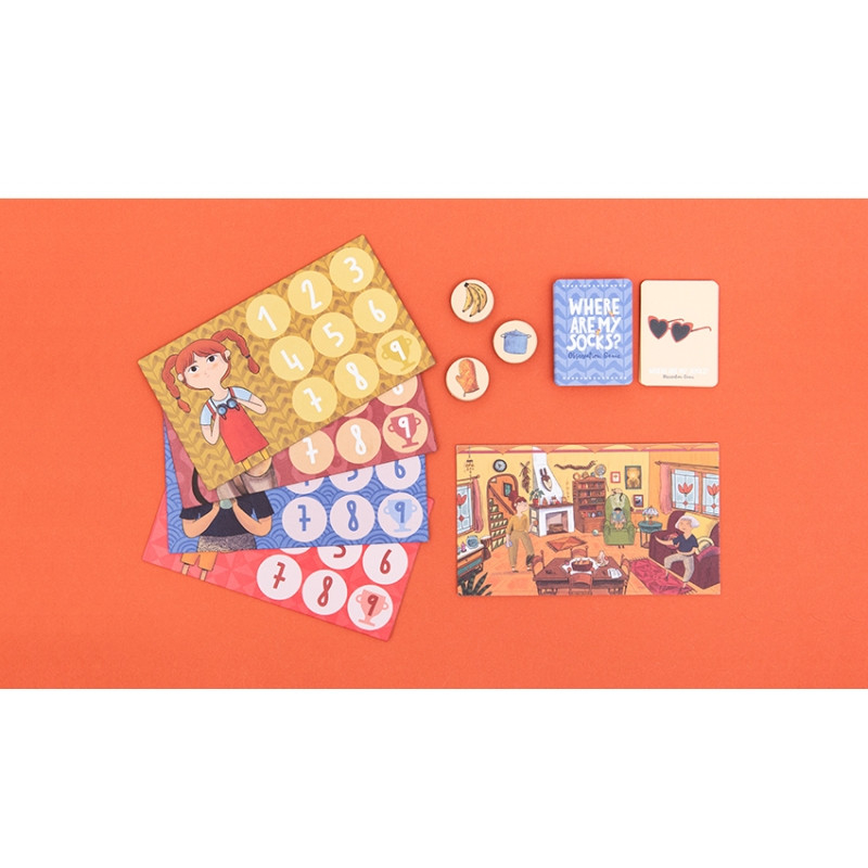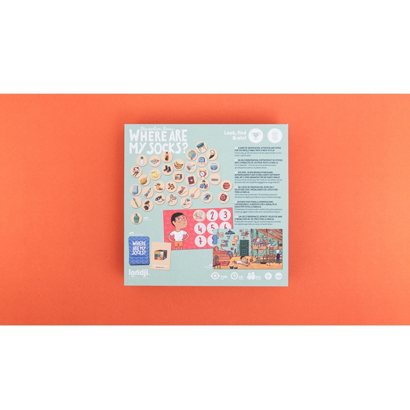 Joc Unde-mi sunt sosesetele Joc distractiv de observație, atenție și viteză pentru întreaga familie. A fost odată ca niciodată o familie care avea o mulțime de obiecte împrăștiate prin casă. Până într-o zi când s-au hotărât să facă ordine. 2 moduri de joc: 1. Modul cu cărți: Toți jucătorii caută în același timp obiectul printre cărți, iar cel care îl găsește cel mai repede îl plasează pe planșa sa personaj. Primul care adună 9 obiecte câștigă! 2. Modul cu tablă de joc: Jucătorul caută jetoanele obiect care apar pe planșa sa, iar primul care adună 15 jetoane din spațiul său câștigă! Un joc ideal pentru a exersa vocabularul, care stimulează observația. Necesită atenție susținută. Vârsta recomandată: 3-103 ani. Confecționat din hârtie FSC și carton reciclat. Conform reglementarilor EN71&ASTM. AVERTISMENT: Contraindicat copiilor sub 3 ani. Se recomandă supravegherea copilului de către un adult în timpul jocului. Producător: Londji, Spania. Ilustrat de Anna Aparicio Català