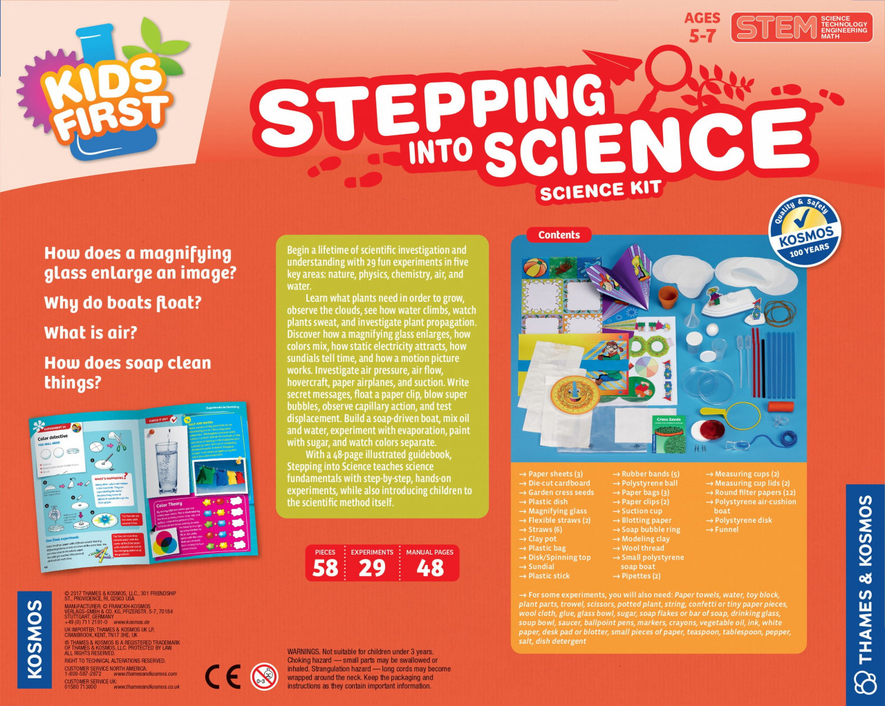 Kit STEM Copiii fac primii pași în știință O primă investigație și înțelegere științifică cu 25 de experimente distractive în domenii cheie precum biologie, fizică, chimie. Aflați de ce au nevoie plantele pentru a crește, construiți un barometru, vedeți cum urcă apa, urmăriți cum transpiră plantele și investigați înmulțirea plantelor. Descoperiți cum mărește o lupă, cum se amestecă culorile, cum atrage electricitatea statică, cum arată timpul cadranele solare și cum funcționează un film. Investighează presiunea aerului, fluxul de aer, hovercraft, avioane de hârtie și aspirație. Scrieți mesaje secrete, faceți să plutească o agrafă de hârtie, suflați super bule, observați acțiunea capilară și testați deplasarea. Construiți o barcă acționată cu săpun, amestecați ulei și apă, experimentați evaporarea, pictați cu zahăr și urmăriți cum se umflă un balon. Conține 58 piese, un ghid de 48 de pagini, Stepping into Science pentru a învăța elementele fundamentale ale științei prin 29 de experimente practice, pas cu pas, introducându-i în același timp pe copii în metoda științifică propriu-zisă. Vârsta recomandată: 5 - 7 ani. Premii Premiul Teachers' Choice 2011 Premiul aprobat de Parents' Choice din 2007 Premiul Preferred Choice Award 2007 din partea revistei Creative Child Confecționat din plastic. Conform reglementarilor EN71&ASTM. AVERTISMENT: Contraindicat copiilor sub 3 ani, conține piese mici. Se recomandă supravegherea copilului de către un adult în timpul jocului. Citiți instrucțiunile înainte de utilizare, urmați-le și păstrați-le pentru referință. Produs in Germania pentru Thames & Kosmos, Anglia. Manual Kit STEM Primii pasi in stiinta - descarca fisier