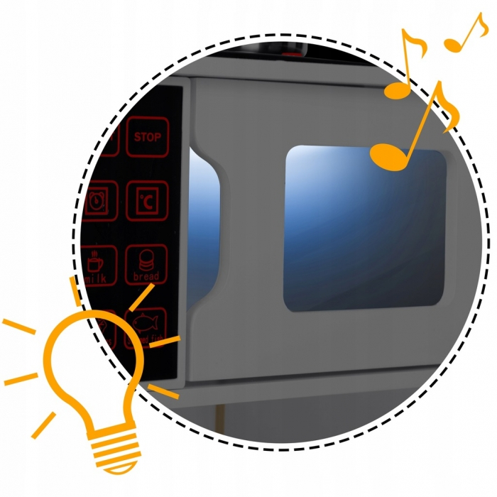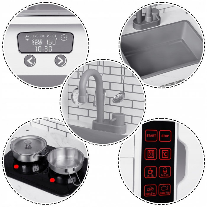 Tuturor copiilor le place sa imite adultii, iar datorita acestei bucatarii copilul tau va avea ocazia sa joace rolul unui bucatar. La dispozitia bucatarului se afla arzatoare cu butoane - pentru a seta temperatura corespunzatoare + sunetul apei clocotite. Hota cu lumina LED si panou de control. Un cuptor si un dulap sunt situate sub blatul de lucru. In partea superioara exista o hota si niste carlige pentru a agata ustensilele necesare.