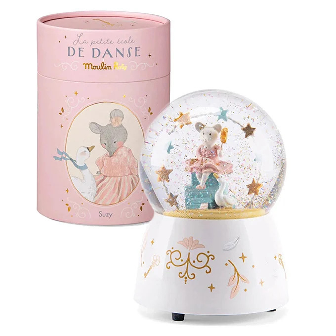 Glob cu zapada muzical Mica scoala de dans Glob de zăpadă muzical cu șoricel și lebada care petrec în mijlocul sclipiciului holografic! Pe lângă faptul că decorează camera copilului, melodia sa dulce va liniști copilul la culcare. Mecanism cu cheiță, nu are nevoie de baterii. Instrucțiuni de spălare: Se poate spăla la suprafață cu o lavetă umedă. Dimensiuni: 15 cm înălțime, 11 cm diametru. Vârsta recomandată: + 3 ani. Conform reglementarilor EN71&ASTM. AVERTISMENT! Contraindicat copiilor sub 3 ani, conţine piese mici, pericol de înghițire. A se folosi sub directa supraveghere a unei persoane adulte. Citiţi cu atenţie eticheta înainte de a înmâna jucăria copilului. Producător: Moulin Roty, Franța.