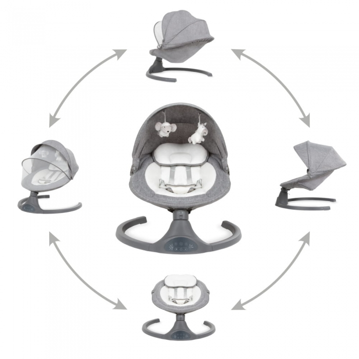 Functionarea silentioasa a motorului nu va impiedica copilul sa adoarma. Reglarea este in 5 trepte - a domeniului de oscilatie in lateral. Reglarea timpului de oscilare - 8, 15 sau 30 de minute. Contine si 10 melodii incorporate cu control al volumului.