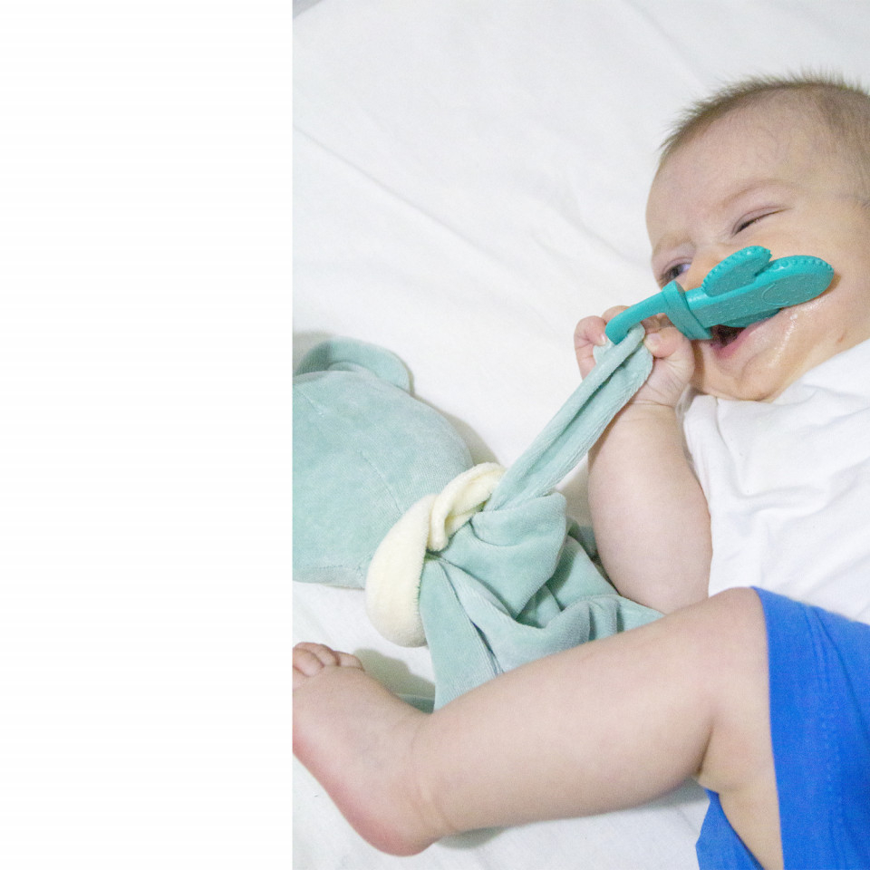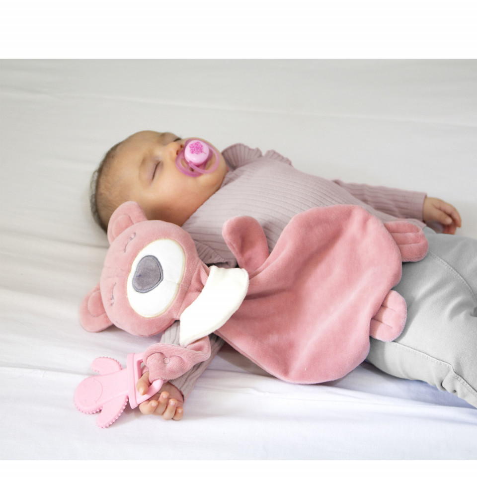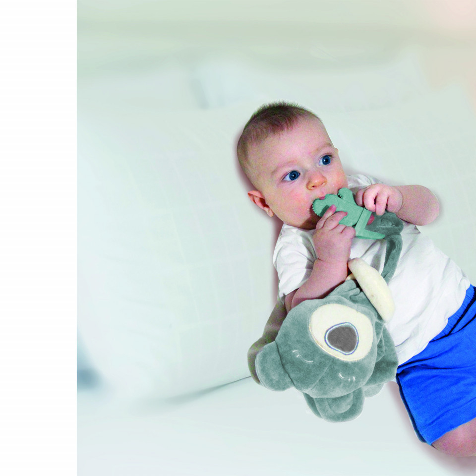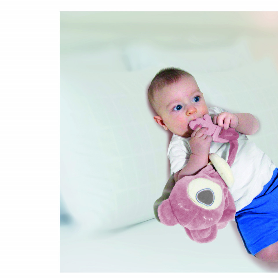 - Jucaria de dentitie atasata pe bratul jucariei il ajuta pe bebelus in timpul eruptiilor dentare calmandu-l datorita texturii sale moi si cu striatii .