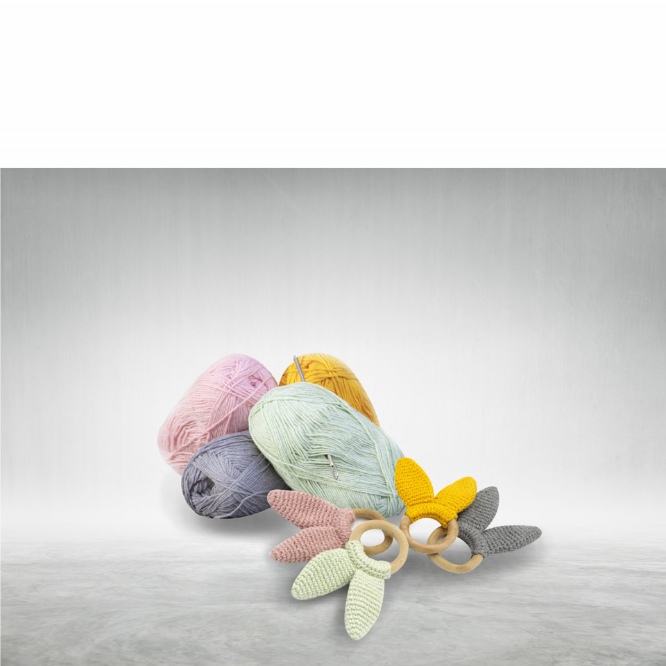 Jucarie dentitie din bumbac cu inelrealizat din lemn de fag.