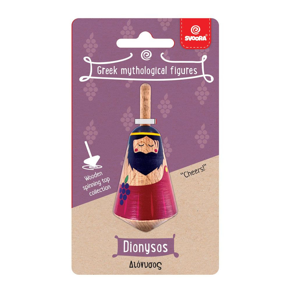 Titirez din lemn, figurina mitologica, Dionysos Noroc! Dionysos, zeul culesului strugurilor și al vinului din mitologia greacă antică, este aici pentru a uimi! Fă cunoștință cu noua colecție de titirezi, inspirată de personaje mitologice. Învârte-l cât poți de tare ca lumea din jurul lui să zboare. Dimensiune titirez 4 x 8 x 4 cm Confecționat din lemn de fag certificat FSC® cu vopsele pe baza de apa, conform reglementărilor EN71 & ASTM. Vârsta recomandată: + 6 ani. Avertisment: Contraindicat copiilor sub 3 ani. A se utiliza sub stricta supraveghere a unei persoane adulte. Producător: Svoora, Grecia.