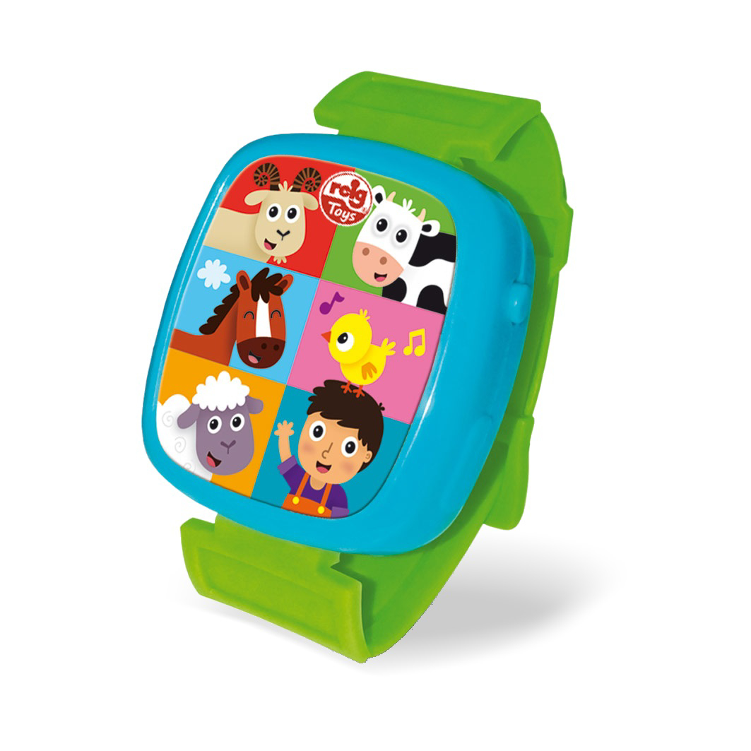 Ceas de jucarie pentru copii cu 12 melodii, 5 sunete ale unor animale cunoscute si lumini care se aprind in ton cu melodia. Varsta recomandata: 3 ani+ Dimensiuni cutie: 10 x 14.5 x 10 cm Dimensiuni produs: 23.5 x 4.5 cm Functioneaza cu 3 baterii AG13 incluse Avertisment: Nu este potrivit pentru copii cu varsta mai mica de 3 ani. Contine piese mici care pot fi inghitite. Prezinta pericol de sufocare! Nu lasati ambalajele la indemana copilului. Va rugam sa indepartati ambalajul produsului inainte de a da jucaria copilului. Pastrati jucaria departe orice sursa de caldura.