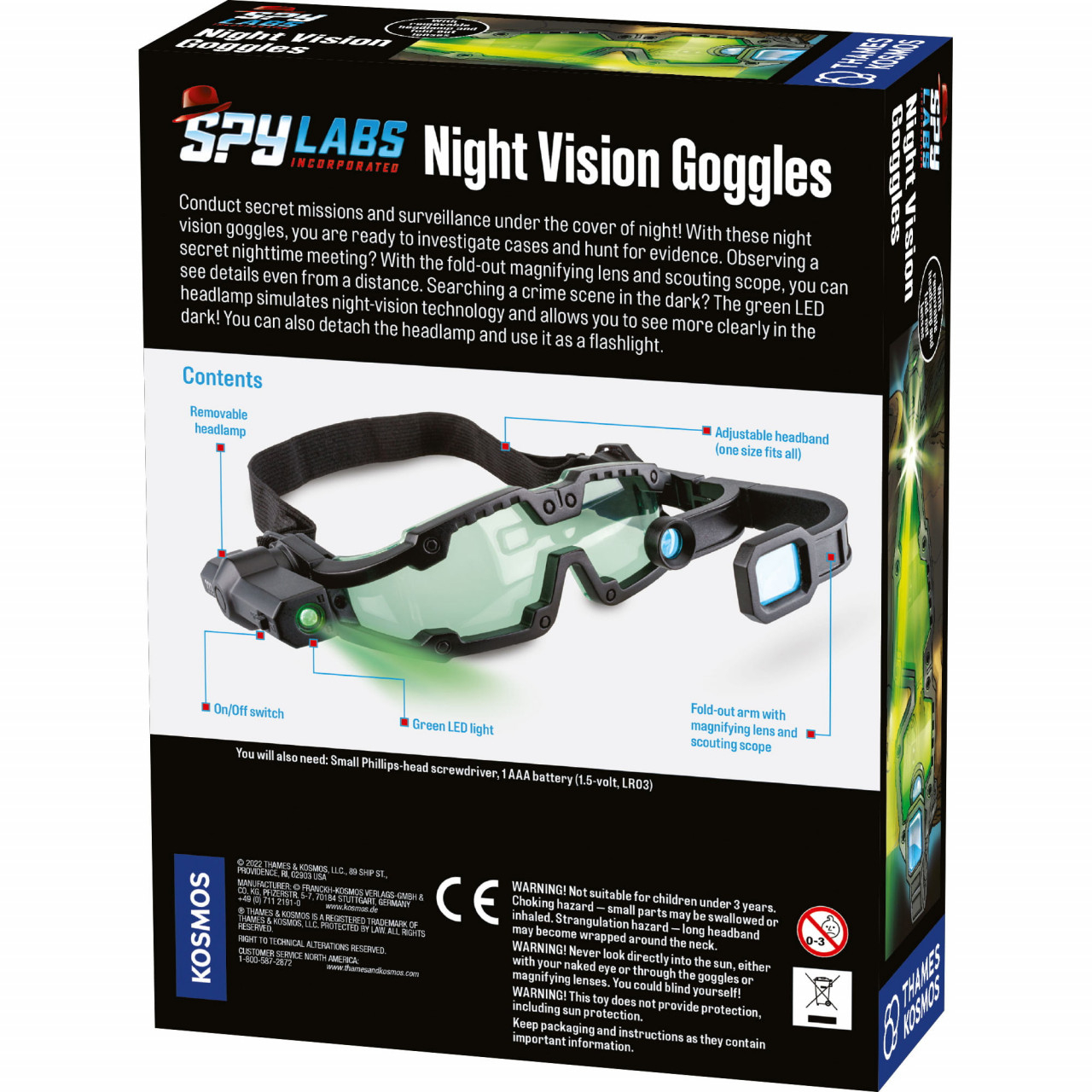 Ochelari de vedere pe timp de noapte Efectuează misiuni secrete și supraveghere sub acoperirea nopții! Cu acești ochelari de vedere pe timp de noapte, ești pregătit să investighezi cazuri și să vânezi dovezi. Observi o întâlnire secretă pe timp de noapte? Cu lentila de mărire rabatabilă și luneta de recunoaștere, poți vedea detalii chiar și de la distanță. Investighezi ceva pe timp de noapte? Lampa frontală cu LED verde simulează tehnologia de vedere pe timp de noapte și îți permite să vezi mai clar în întuneric! Kiturile de activități și echipamentele Spy Labs oferă copiilor o modalitate atractivă și interactivă de a învăța despre munca de detectiv, inclusiv despre analiza criminalistică și tehnicile de urmărire. Acești incredibili ochelari de vedere pe timp de noapte au o lentilă de mărire rabatabilă și o lunetă de recunoaștere, astfel încât să poți supraveghea activitatea pe timp de noapte, chiar și de la distanță! O lampă frontală cu LED verde care simulează tehnologia de vedere pe timp de noapte poate fi, de asemenea, detașată de ochelari și utilizată ca lanternă. Devino un agent secret de primă clasă cu Spy Labs, experții în echipamente pentru detectivi; sursa ta de încredere pentru toate instrumentele și echipamentele esențiale de spionaj! Vârsta recomandată: 8+ ani. Confecționat din plastic. Conform reglementarilor EN71&ASTM. AVERTISMENT: Contraindicat copiilor sub 3 ani, conține piese mici. Se recomandă supravegherea copilului de către un adult în timpul jocului. Citiți instrucțiunile înainte de utilizare, urmați-le și păstrați-le pentru referință. Produs in Germania pentru Thames & Kosmos, Anglia. Manual Ochelari de vedere pe timp de noapte, Thames & Kosmos - descarca fisier