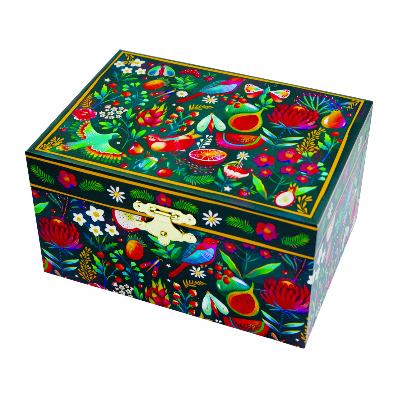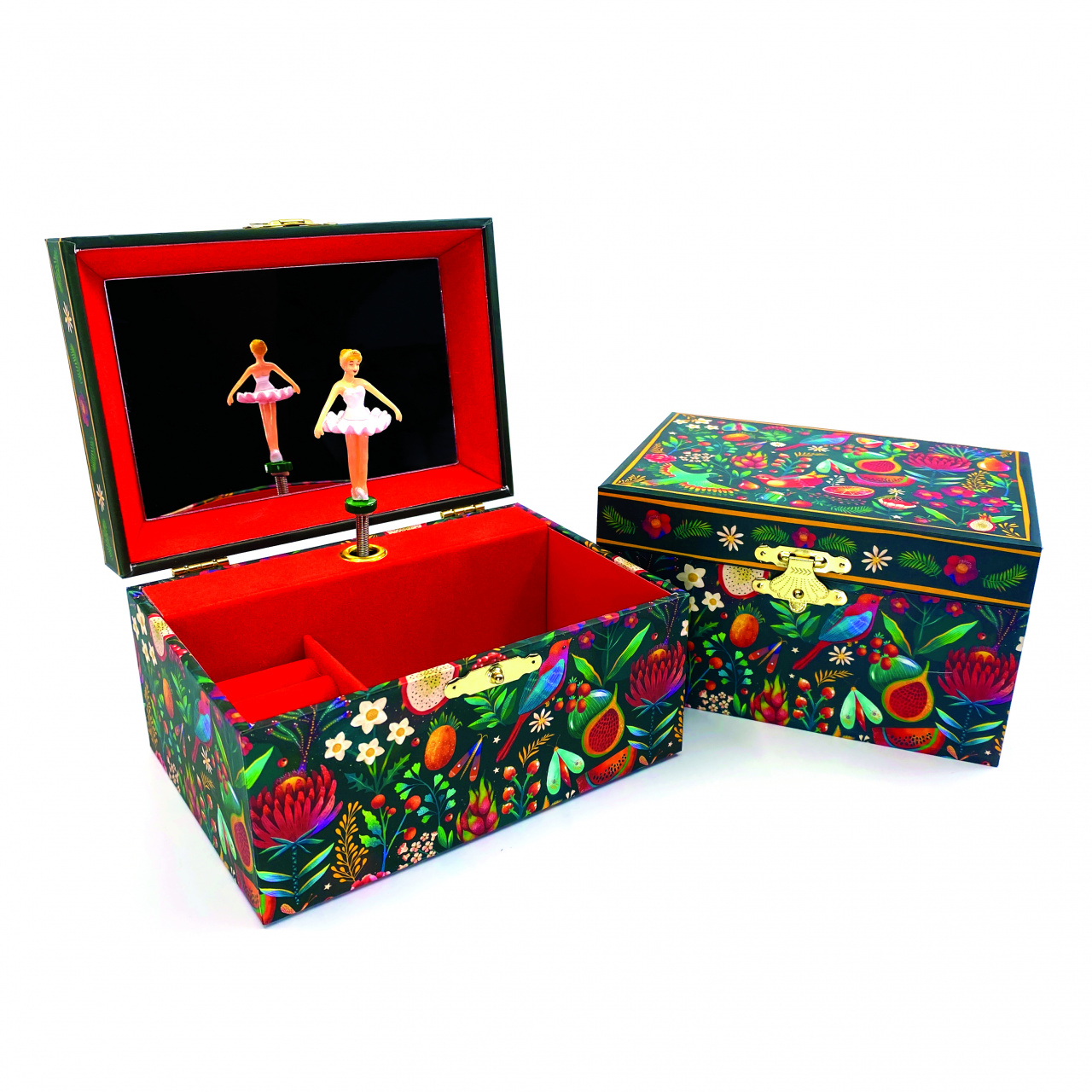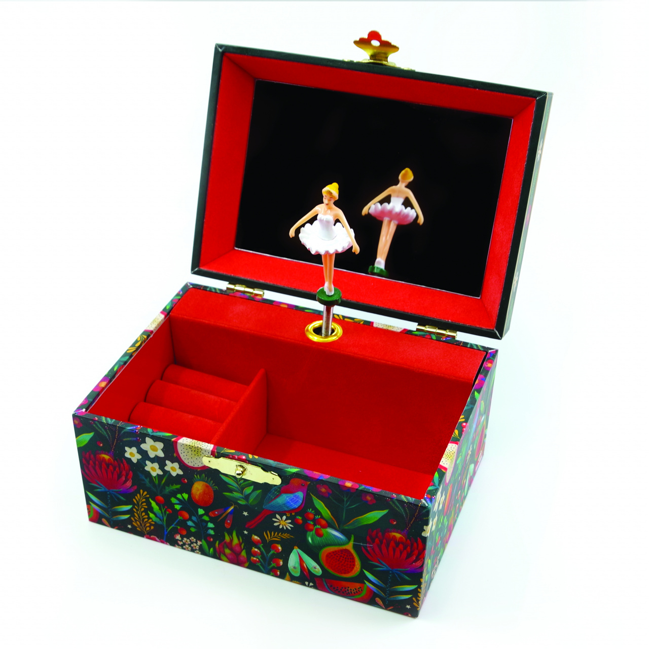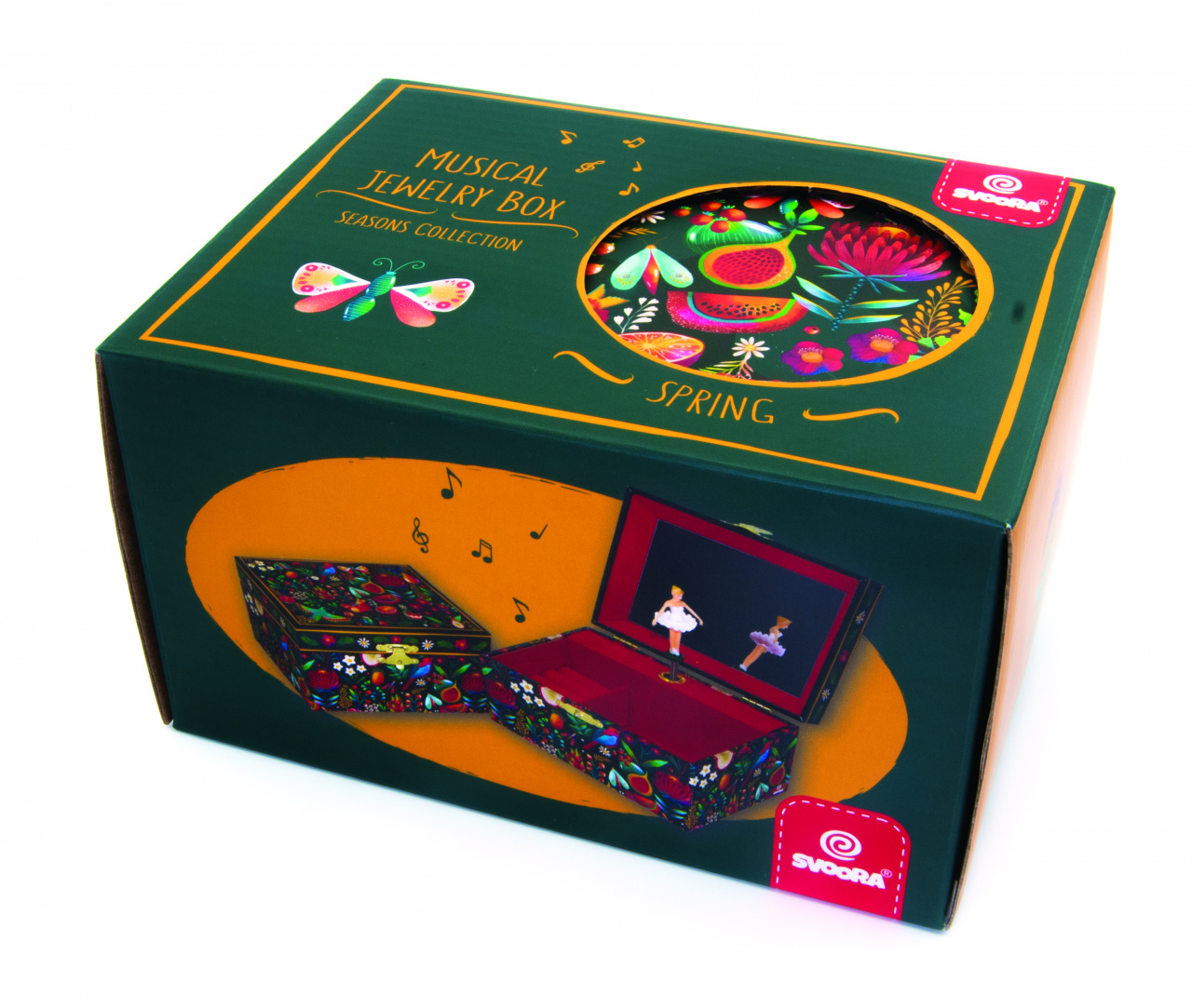 Cutie de bijuterii muzicala Vara O cutie de bijuterii muzicală variantă retro, un obiect fermecător de care nu te vei despărți niciodată! Rotește, deschide și lasă muzica să te ducă într-o lume magică! Cutia de bijuterii oferă suficient spațiu pentru a depozita comorile prețioase. Inspirată din colecția Anotimpuri, cutia colorată cu imprimare UV, conține oglindă, figurina balerina rotitoare și suport pentru inele. Melodie: Dance of the Sugar Plum Fairy. Dimensiune cutie muzicală: 15 × 8.5 × 11 cm . Vârsta recomandată: +4 ani. C onfecționată din velur, MDF, balamale metalice, mecanism pentru cutie muzicală, hârtie tiparită. AVERTISMENT: Articol decorativ. Nu este jucărie. A nu se lăsa la îndemâna copiilor sub 3 ani. Producă tor: Svoora