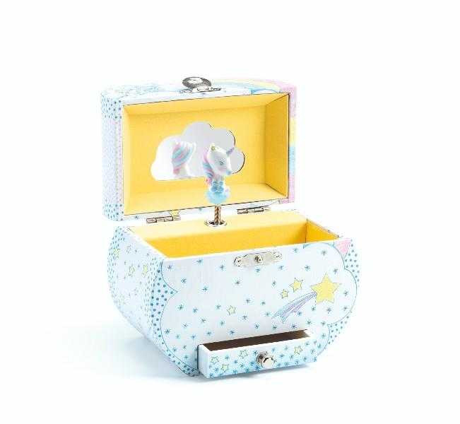 Cutie muzicala Visul unicornului Visul unicornului este o cutie muzicală în formă de nor, căptușită cu catifea, cu un sertar pentru a păstra bijuterii și lucruri secrete. Întoarce cheița, deschide cutia și lasă-te surprins! Un unicorn delicat se retoște, reflectat într-o oglindă în formă de nor. Melodia „Dunărea Albastră” de Johann Strauss, durează aproximativ 2 minute și 30 de secunde. Conținut: o cutie muzicală de bijuterii din lemn acoperită cu hârtie, căptușeală de catifea, cu sertar. Dimensiune cutie muzicală: 14,7 x 14,2 x 8,2 cm. Vârsta recomandată: +4 ani. Confecționată din lemn, carton, textil și metal. Conform reglementărilor EN71&ASTM. Certificare FSC®. AVERTISMENT: Acest articol nu este jucărie. A nu se lăsa la îndemâna copiilor sub 3 ani. Producător: Djeco, Franța.