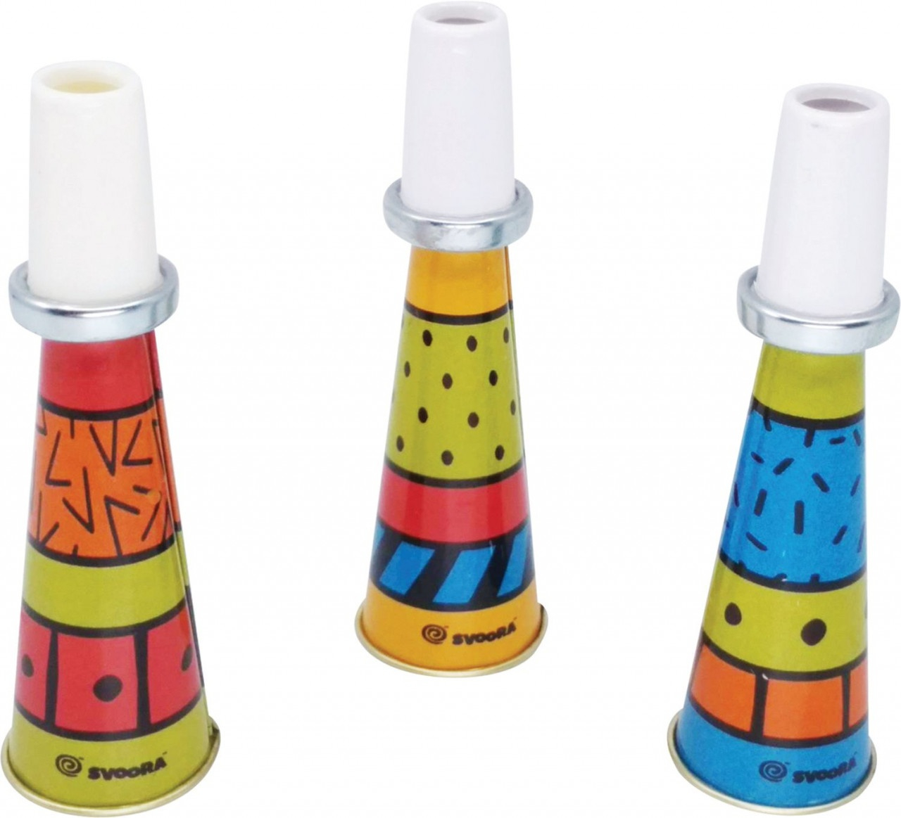 Mini trompeta metalica colorata Pah-pa-rah! Pah-pa-rah! Ia mini trompeta și lasă spectacolul muzical să înceapă! O colecție de 3 mini trompete metalice pentru explorări muzicale distractive! Vârsta recomandată: + 4 ani. Fabricat din metal și plastic. Conform standardelor EN71, ASTM. AVERTISMENT! Contraindicat copiilor sub 3 ani. A se folosi sub directa supraveghere a unei persoane adulte. Producător: Svoora, Grecia