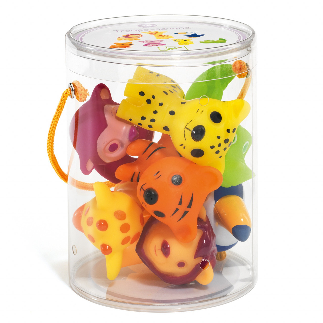 Animalute din silicon, Troopo savana 7 animăluțe prietenoase, de culori diferite, din silicon non alergic. Tovarăși buni de joacă și la băiță. Materialul moale este confortabil de manevrat pentru mâinile mici. Vârsta recomandată: +18 luni. AVERTISMENT: Contraindicat copiilor sub 18 luni. A se folosi sub directa supraveghere a unei persoane adulte. Înlăturați ambalajul înainte de a oferi jucăriile copilului. Producător: Djeco, Franța.