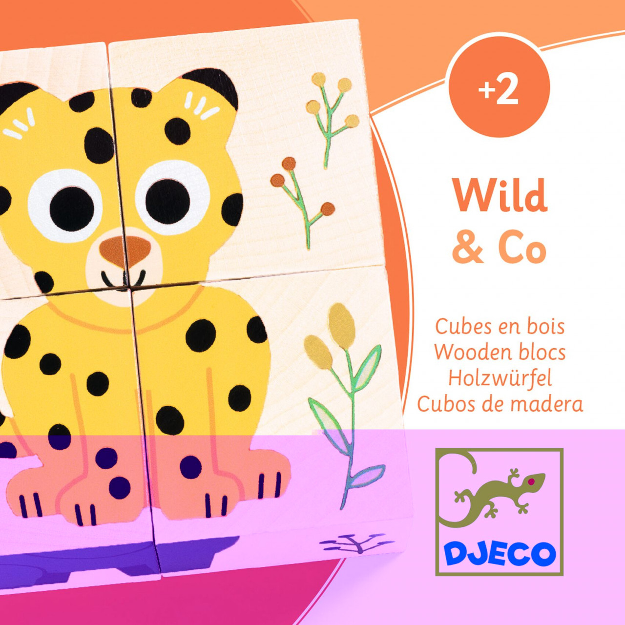 Puzzle din cuburi de lemn Animale salbatice, Djeco
