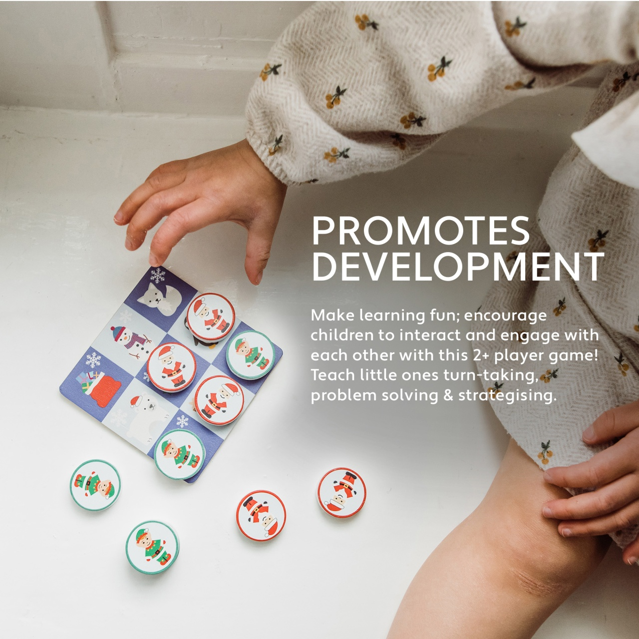 Joc tic tac toe din lemn O versiune de sărbători a jocului tradițional, tic tac toe. O planșă de lemn pe care sunt imprimate ilustrații cu pinguini și urși polari și 10 piese cu 2 personaje diferite din Tărâmul Minunilor de Iarnă! Copiii sunt încurajați să interacționeze învățând să rezolve probleme și să elaboreze strategii. Se așază pe rând câte o piesă pe planșă, până când câștigătorul are 3 piese identice la rând. Rândul poate fi pe orizontală, verticală sau diagonală. Setul este livrat într-un săculeț practic cu cordon pentru depozitarea comodă a pieselor. Conține o planșă din lemn cu ilustrații (10 x 10 cm) și 10 piese cu 2 ilustrații diferite (3 cm), săculeț din bumbac pentru depozitarea pieselelor. Vârsta recomandată: +3 ani. Confecționat din lemn FSC®, cu vopsele pe baza de apă. Conform reglementărilor EN71&ASTM. A se folosi sub directa supraveghere a unei persoane adulte. Produs în China pentru Orange Tree Toys, Anglia.