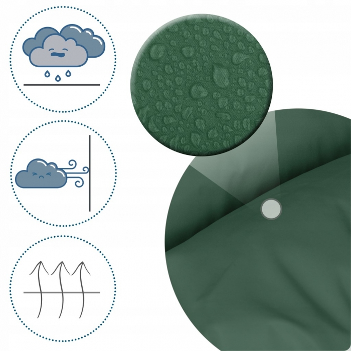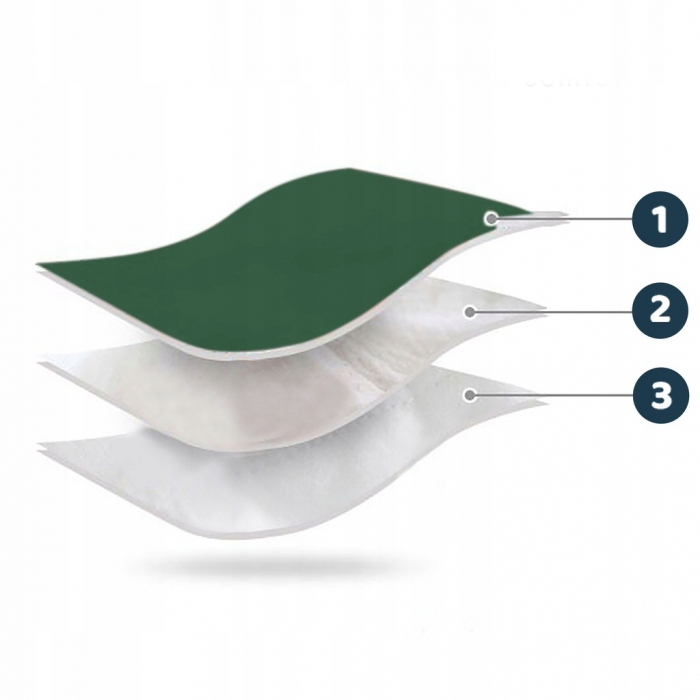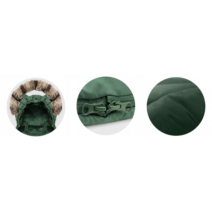 Saculet cu 3 straturi, de inalta calitate: un strat superior care garanteaza impermeabilitatea si rezistenta la vant, stratul mijlociu umplut cu material cald, puf, antialergic, iar stratul interior conceput pentru a asigura un drenaj adecvat al umiditatii si pentru a mentine temperatura corecta.