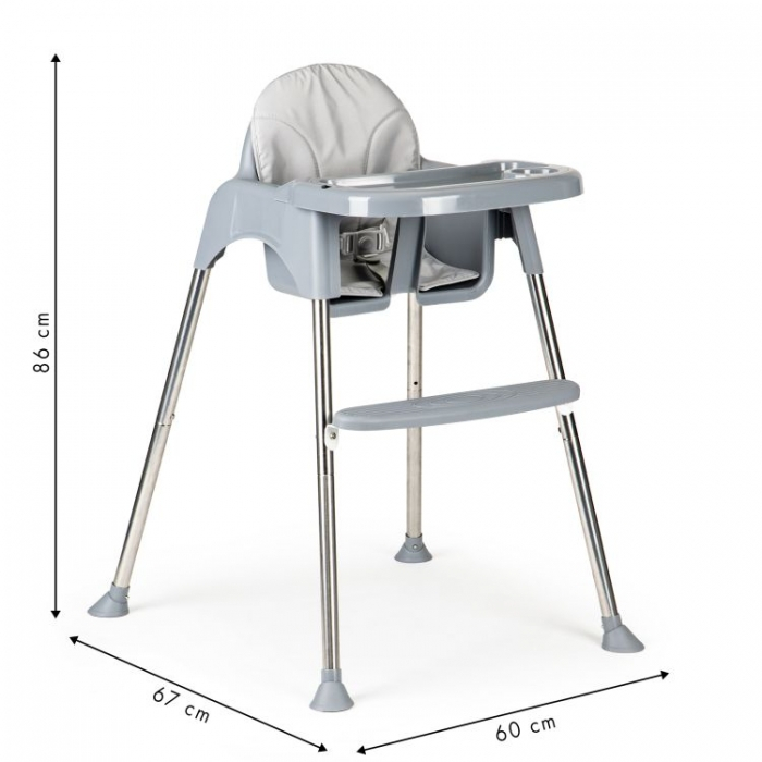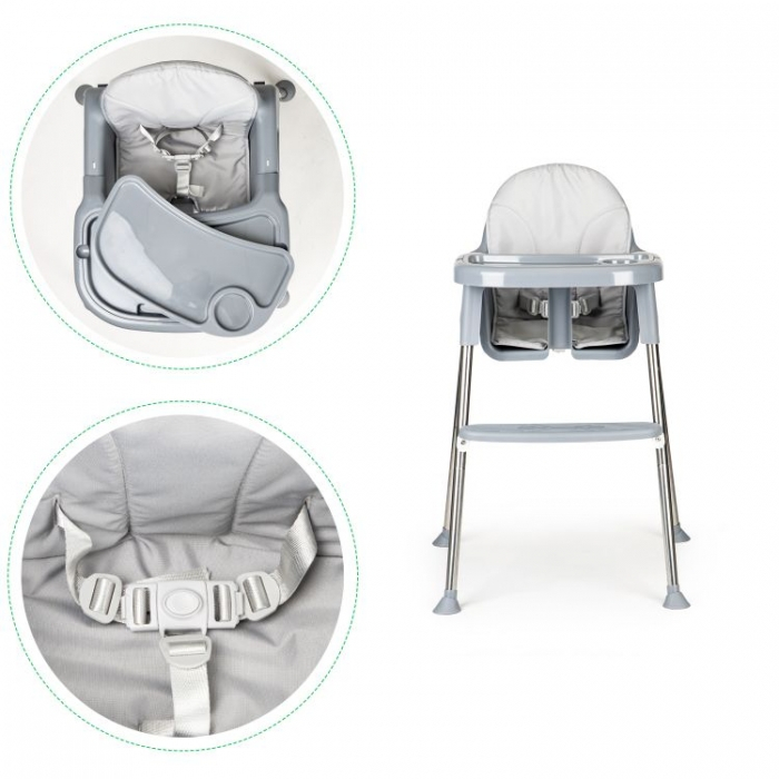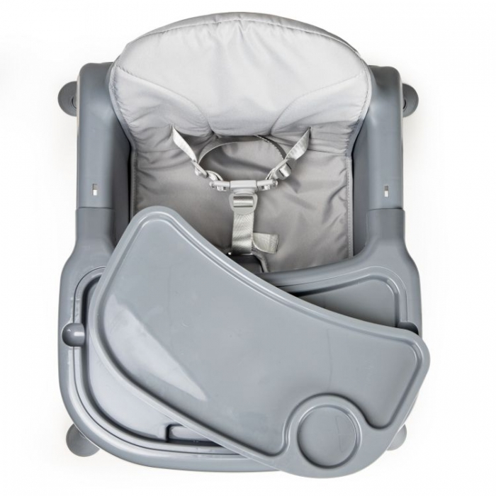 Scaunul de masa are picioare antiderapante din cauciuc, care protejeaza suplimentar podeaua impotriva zgarieturilor. Blocarea pentru copii impotriva alunecarii si centurile de siguranta in 5 puncte ofera cea mai inalta protectie pentru un copilas. Scaunul are un suport pentru picioare si o tava detasabila conturata. Husa scaunului de masa poate fi indepartata cu usurinta pentru a putea fi curatata.
