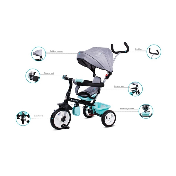 Centurile si bara de siguranta protejeaza copilul impotriva caderii de pe bicicleta. Tricicleta Fresh 360 respecta standardul EN71.