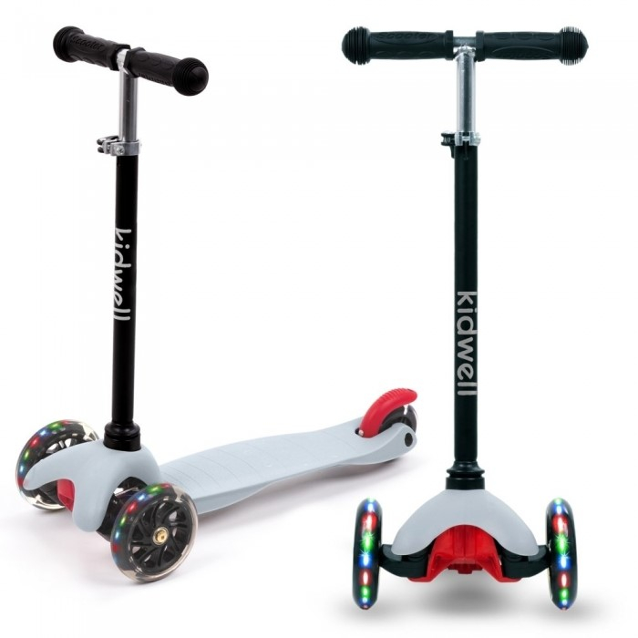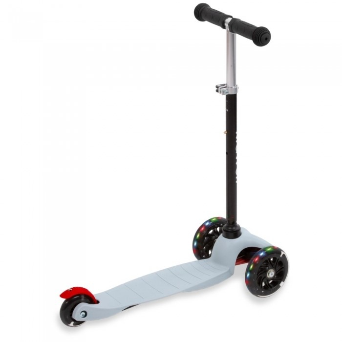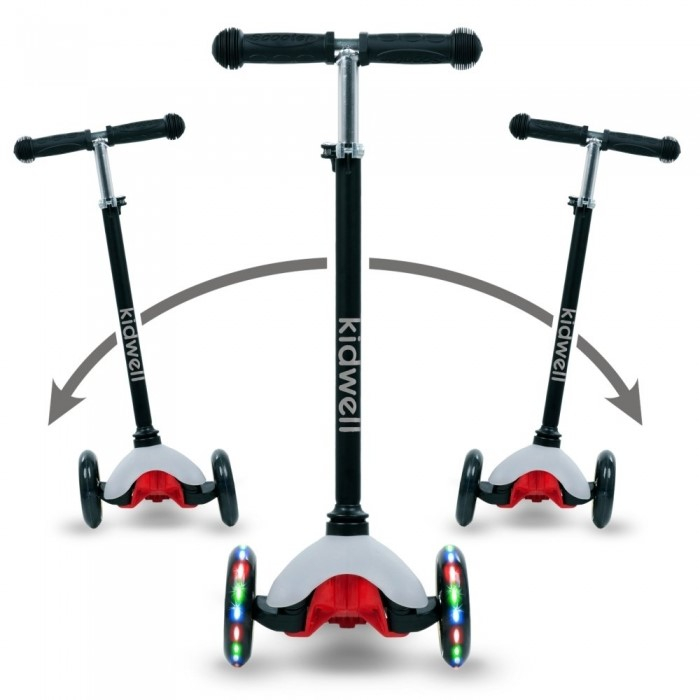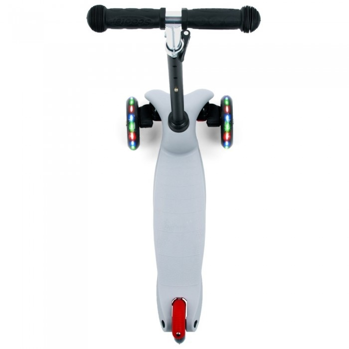 Structura durabila, usoara, cantarind 1.8 kg. Platforma larga de pe rotile din fata ajuta la mentinerea echilibrului. Rotile din poliuretan silentioase si durabile asigura o aderenta foarte buna la sol. Luminile cu LED incorporate in roti care stralucesc in timpul conducerii. Trotineta poate fi pliata scotand tija de directie. Ghidon din aluminiu cu reglare pe 3 cai a inaltimii. Unghiul limitat de directie minimizeaza schimbarea necontrolata de directie. Prezinta manere ergonomice la ghidon, platforma antiderapanta, frana pe puntea spate, rulmenti durabili.